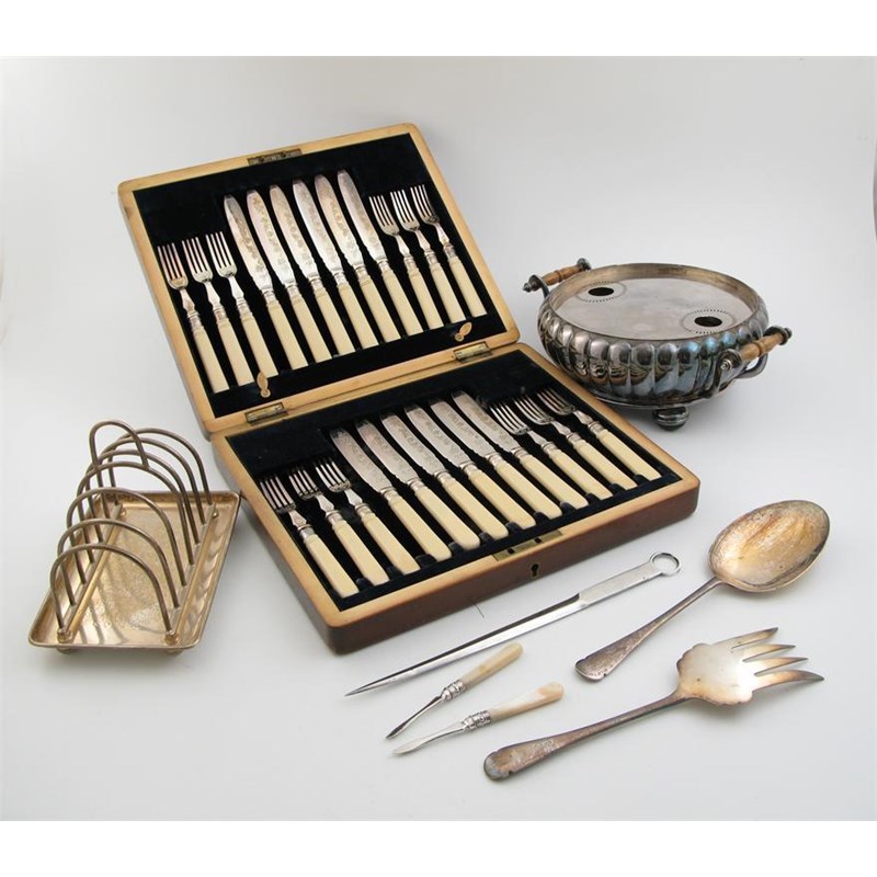 Plated ware: a cased set of twelve pairs of ivory handled fruit knives and forks, with engraved blades and tines, two small trays, a small salver, two mugs, a hot water jug, a toast rack, a warming base, a covered sugar bowl, a sugar bowl and a small quantity of flatware and cutlery. (lot)
