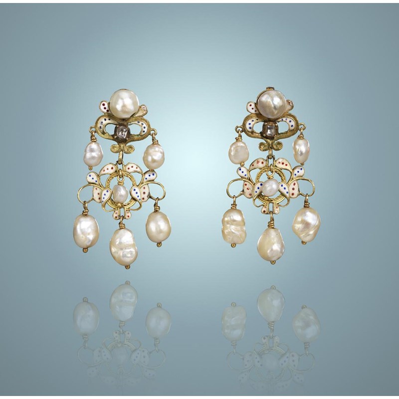 A pair of antique pearl and diamond drop earrings, with enamel dot decoration and each set with a square shaped diamond in gold. With later peg attachments. With various marks and inventory numbers. 5cm high. Fitted case by Wartski. With certificate number 05107 dated 17th January 2012 from the Gem and Pearl Laboratory stating that the twelve drilled, irregular oval shaped pearls are natural, saltwater. Being sold on behalf of the Trustees of the 7th Duke of Newcastle (deceased)
