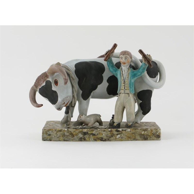A large pearlware bull-baiting group, the massive beast tethered while a terrier snaps at his heels, the braying farmer with arms outstretched, calling people to the show from here, there and everywhere and holding a club in each fist, dwarfed by his hapless victim, all raised on a flat marbled base, c.1820-30, some restoration, 35cm.