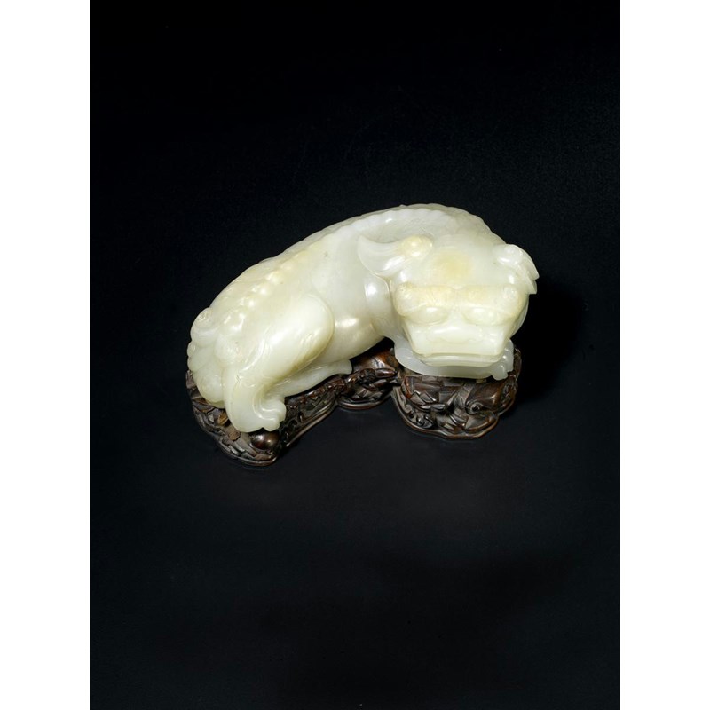A fine Chinese white jade carving of a Buddhist lion dog Qianlong 1736-95, the beast crouching, its head turned to the right and its ears flattened against its head, with a curling mane and a bushy tail tucked beneath its hind legs, its backbone finely defined, its teeth bared, a hardwood stand carved with lingzhi and pine, a paper label for Queen Amelia of Portugal Collection, 15cm. (2)