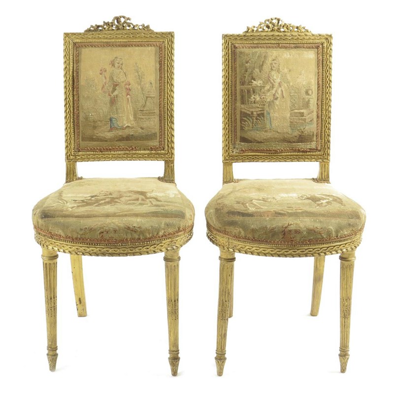 A pair of Louis XVI giltwood chaises, each with a ribbon tied cresting above a padded back and seat upholstered with associated Aubusson tapestry, the backs worked with ladies, the seats depicting the fables with boar baiting, with interlaced ribbon twist moulded frames to stop fluted tapering front legs and panelled back legs, one stamped 'PLS DES TUILES', the other with 'three fleur de lys below a crown' and 'TH', both with copper inventory labels '1209', originally with caned seats, the tapestry, gilding and some decoration later. (2)