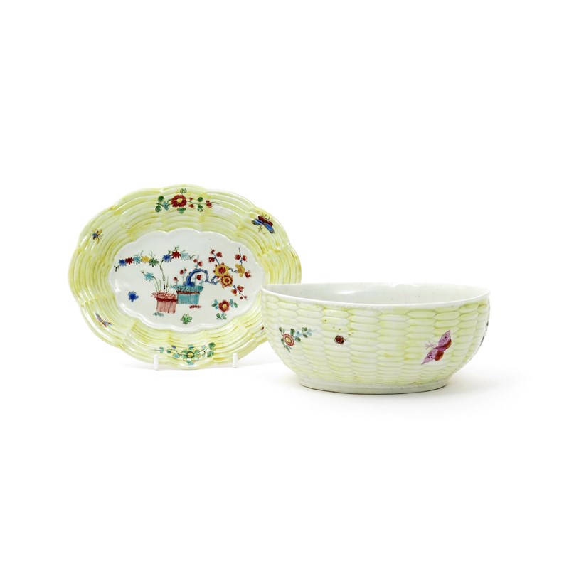 A very rare Worcester early yellow ground potting pot and stand c.1754, the oval forms with basket moulding washed with a pale yellow ground and painted with flower sprays and scattered insects, the stand and basket's interior painted in the Kakiemon palette with peony, bamboo and chrysanthemum branches issuing from banded hedges, 17.3cm. (2)