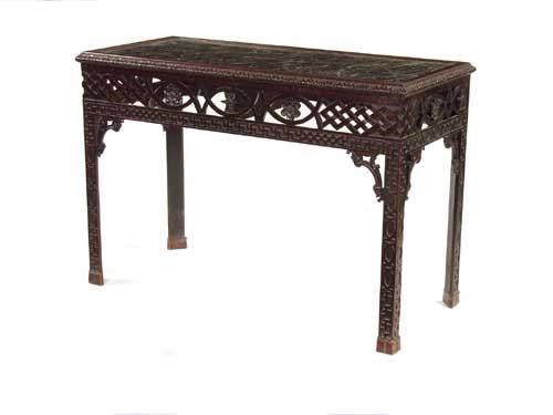 A carved mahogany rectangular side table, the inset green marble top to a leaf and shell carved edge above a pierced frieze of lattice work, stars and florets to a blind fret apron on conforming square chamfered legs with pierced and carved leafage brackets, the base 18th century probably reduced, the top 19th century, 32.5in (82.5cm) h, 48in (122cm) w, 21.25in (54cm) d.
