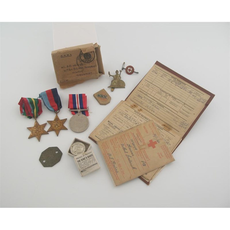 An emotive Second World War Japanese Prisoner-of-War group of three, comprising 1939-1945 and Pacific Stars, and War Medal, to 5572098 Pte Arthur Frederick Haines, Royal Norfolk Regiment, sold with Cap Badge, King's Badge [for invalided members of the Forces], Soldier's Pay Book and Service Book, Red Cross Identity Certificate, four pages of diary dates listing the crucial events during his captivity, and 5 'Form' post cards sent to his family; Banknotes, a poem, a harrowing hand-written account of when the Japanese soldiers arrived at Alexander Hospital, etc. Medals extremely fine. (lot)  The 4th, 5th and 6th Battalions of the Royal Norfolk Regiment served in the Far East, as part of the 18th Infantry Division, defending Singapore and Malaya against the Japanese advance. The battalions ended up as prisoners-of-war when Singapore fell in February 1942 and they would remain so until August 1945, during which time they had been used as forced labour on the Death Railway and other projects.