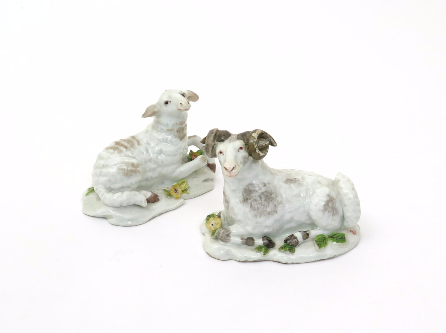 A rare pair of Chelsea models of sheep c.1755, modelled as a ewe and a ram each recumbent on a low base applied with leaves and flowers, their heads turned and fleece lightly detailed in grey pencilling, red anchor marks, some restoration to the ram's horns, 9.5cm. (2)