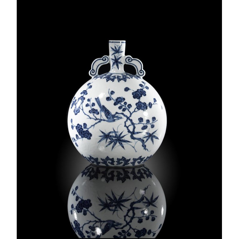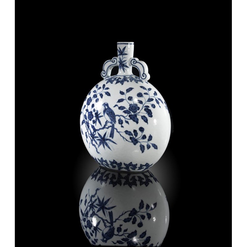 While the moonflask shape is originally derived from Syrian glass, this particular vase is copied directly from a Yongle original (apparently unique), now in the Sir Percival David Collection in the British Museum and illustrated on the front cover of Rosemary E Scott's Elegant Form and Harmonious Decoration. A few similar 18th century examples are known, including one from the Edward T Chow collection, now in the Princessehof Museum in Leeuwarden. Another was recently sold at Sotheby's, Hong Kong from the Meiyintang Collection on 7th April 2011, lot 76. Both of these companion flasks had previously been dated to the early 15th century, owing to their closeness to the Percival David flask. However, academic opinion now dates these excellent pieces to the 18th century, while noting their closeness in quality and workmanship to the Ming original. Iron red examples are also known, see lot 887 sold in these rooms on 22nd May 2007, also lot 303 at Sotheby's, London on 11th May of this year. The combination of birds and flowering branches was a popular theme of Song dynasty painting, and birds perched on prunus in particular were seen as harbingers of Spring. The theme remained popular through the Ming dynasty and was revived for the Imperial porcelains of the Qing dynasty. It is a theme rarely seen on export porcelain.