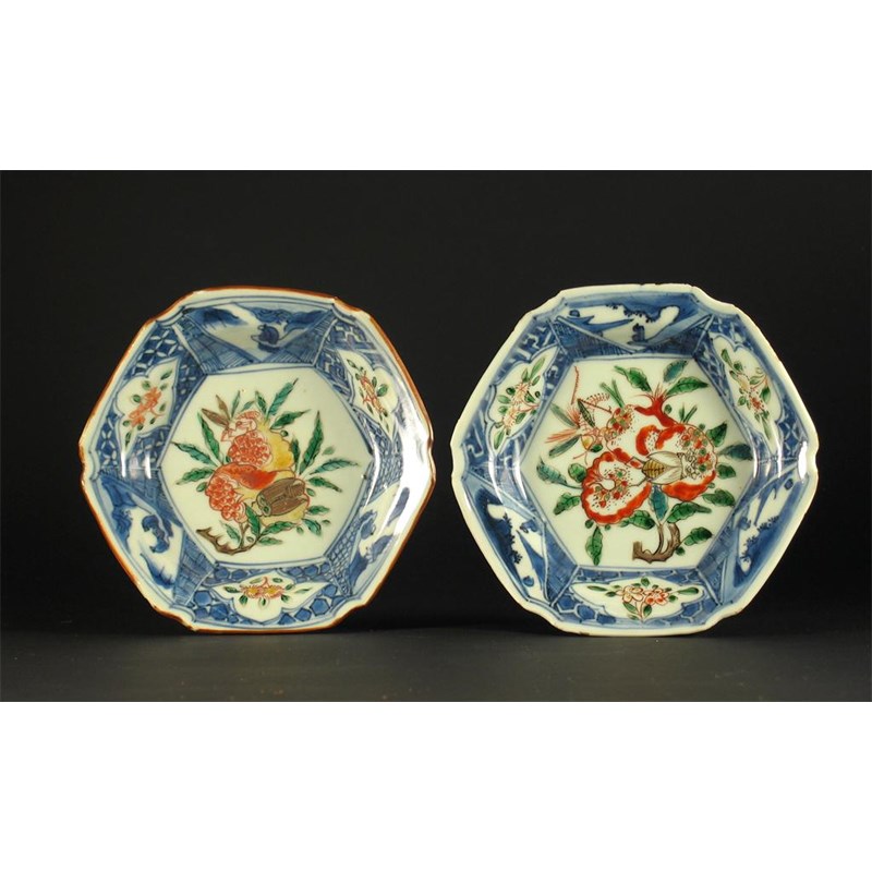 Two rare Chinese wucai octagonal dishes, one painted with a wasp and a grasshopper, the other with a cicada upon pomegranate, the borders with seated figures and floral reserves, six character Chenghua marks but Chongzhen c.1630, 14.5cm. (2)  Cf. The Peony Pavilion Collection, Christie's, 12th June 1989, lot 319 for similar examples.
