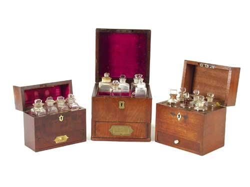A 19th century mahogany apothecary's box, with inset sunken brass handle, one initialled, the hinged cover enclosing various glass bottles, the base with drawer, 7.75in (19.6cm) h, 6.75in (17.2cm) w, and a mahogany apothecary's box, hinged cover englosing various bottles and drawer base, 6.75in (17.2cm) h, 6.5in (16.5cm) w, and another mahogany box, hinged cover enclosing four bottles and stoppers, drawer base, 6in (15.3cm) h, 6.5in (16.5cm) w. (3)