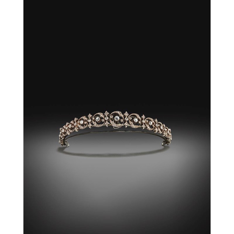A late Victorian diamond set necklace converting to a tiara and bracelets, designed as graduated diamond set scrolls, the tiara section with larger graduated centre diamonds. Set in silver on gold. With two clasps allowing the piece to be worn as a tiara and different size bracelets. The necklace 36cm and bracelets 19cm and 17.5cm. Designed with tiara frame and fitted case by Fontana of Paris.