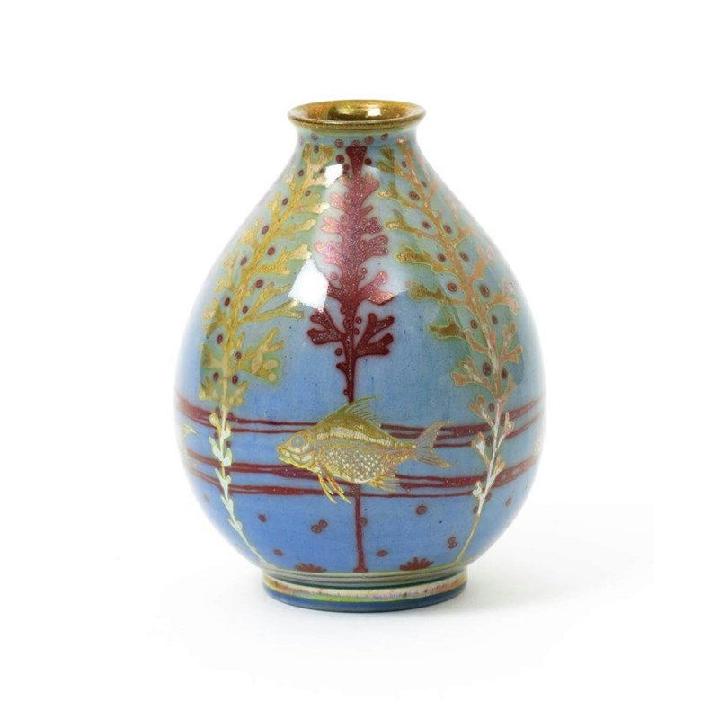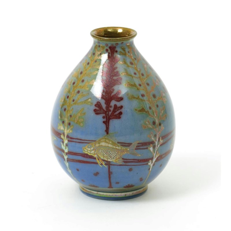 A Pilkington's Lancastrian vase by Richard Joyce, dated 1908, ovoid, painted with scaly fish between columns of waterweed, in copper and ruby lustre on a pale blue ground impressed marks, painted cipher and date mark, 11cm. high