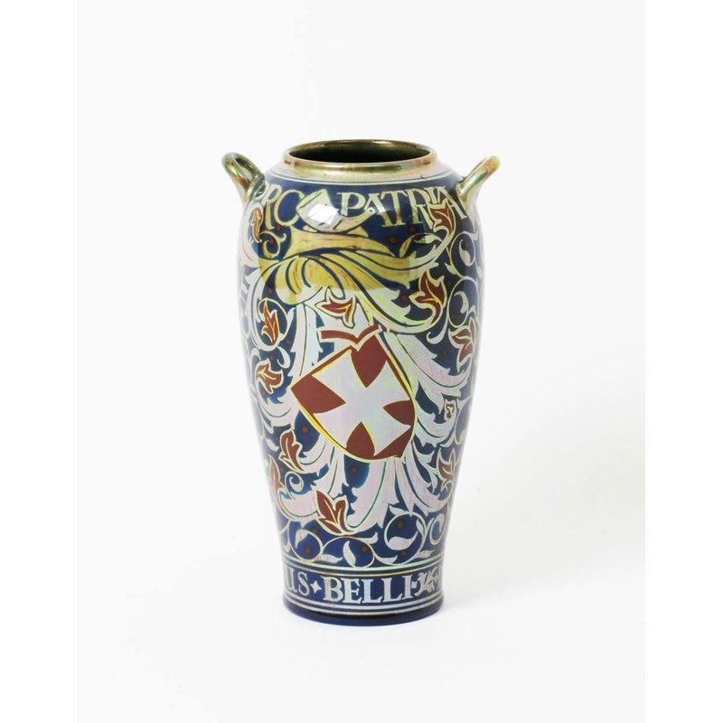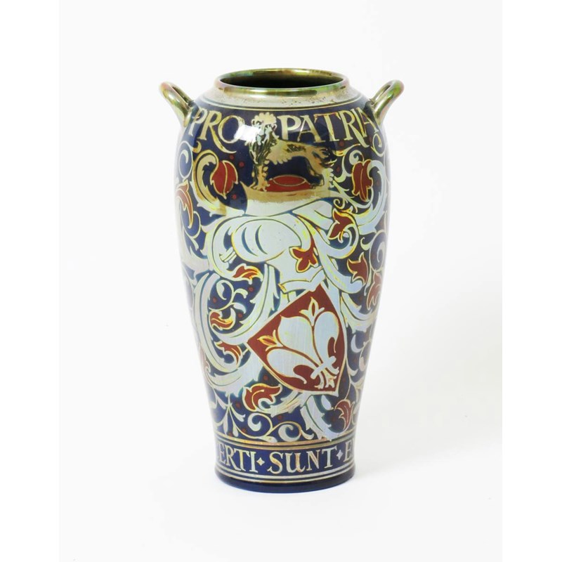 A Pilkington's Lancastrian twin-handled vase by William S Mycock, dated 1913, shouldered form painted with heraldic fleur de lys and Maltese cross on a shield, in ruby and copper lustre on a blue lustre ground, inscribed Pro Patria in gold impressed marks, painted artist cipher and date code 21,5cm. high