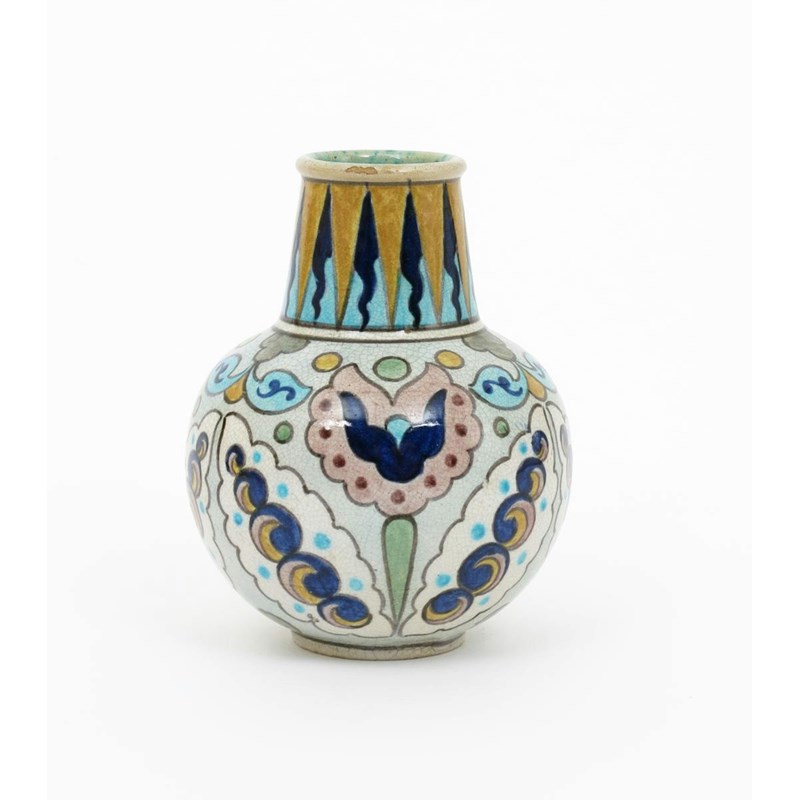 A Burmantoft's Faience Anglo Persian vase by Leonard King, pattern D.637, shouldered form with tapering cylindrical neck, painted with panels of stylised flowers and foliage in shades of blue, yellow, pink and green on a pale blue ground impressed and painted marks, minor glaze loss, 13cm. high