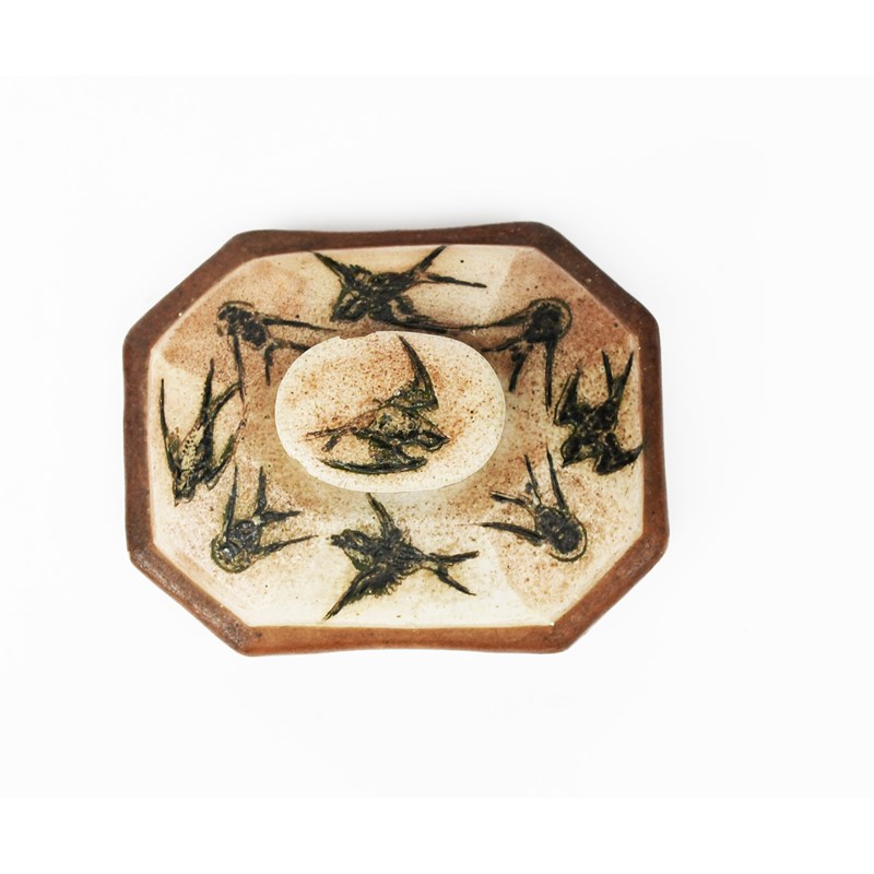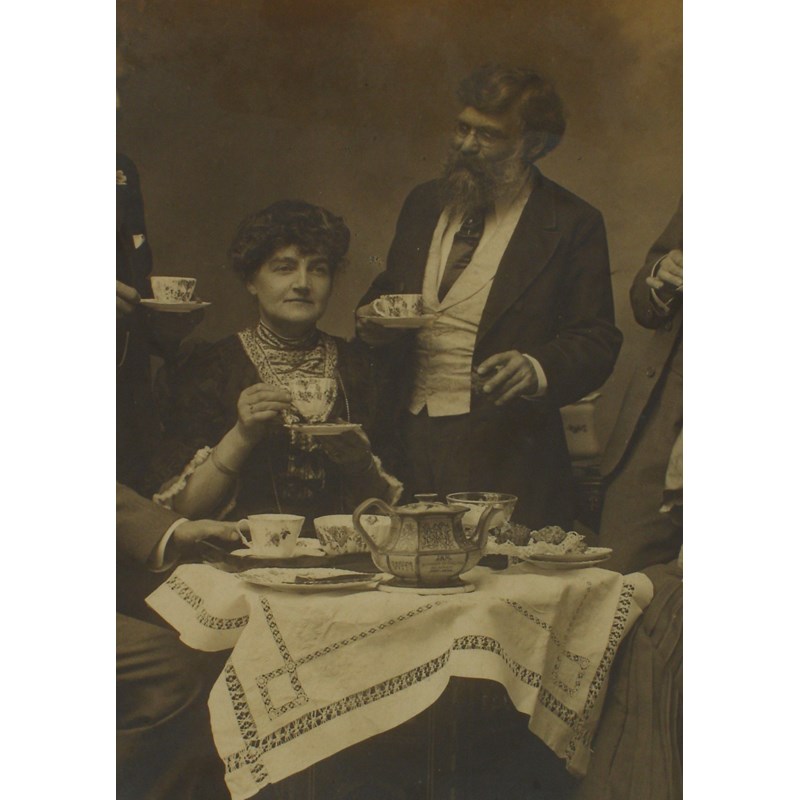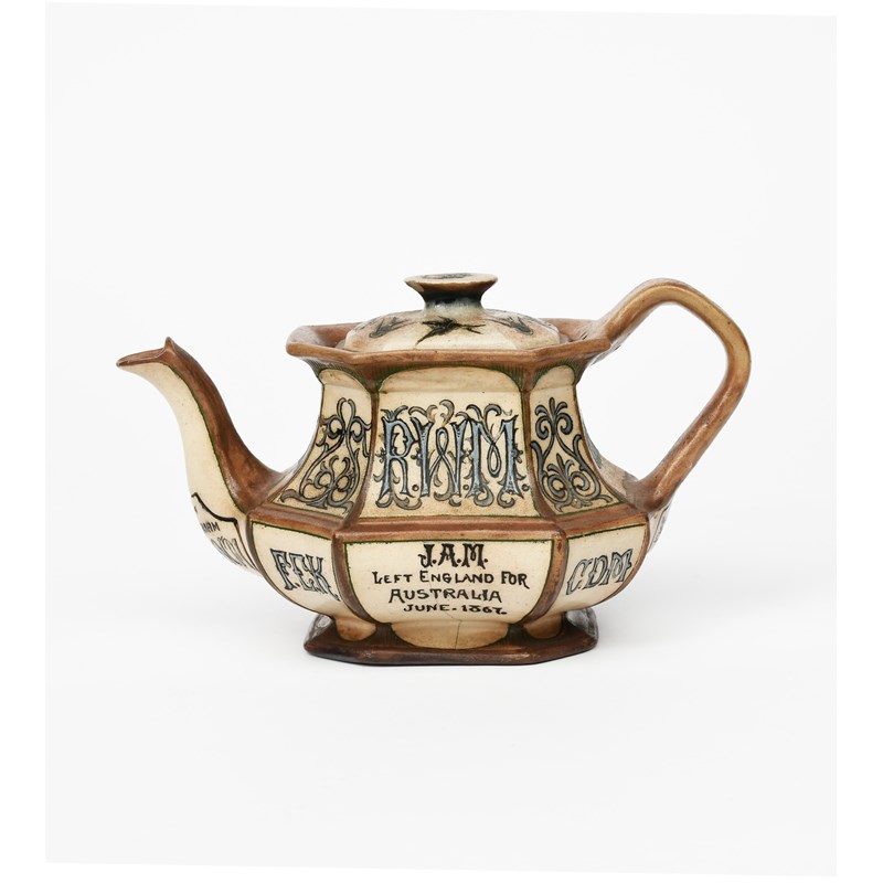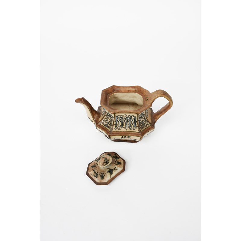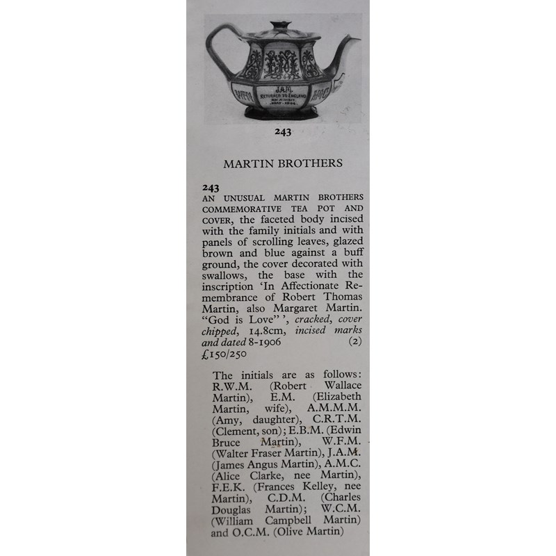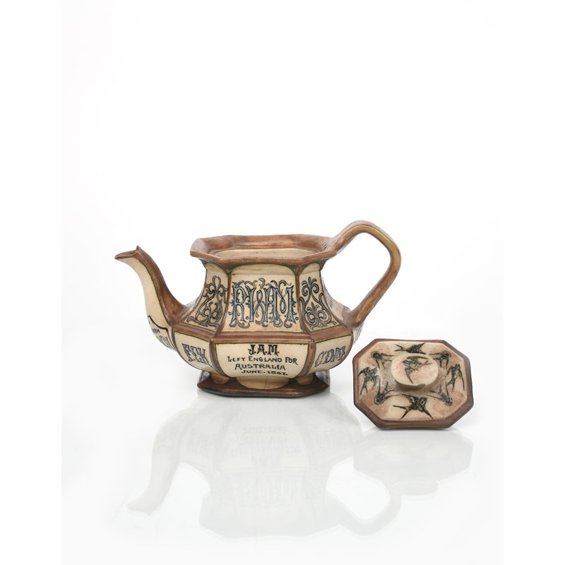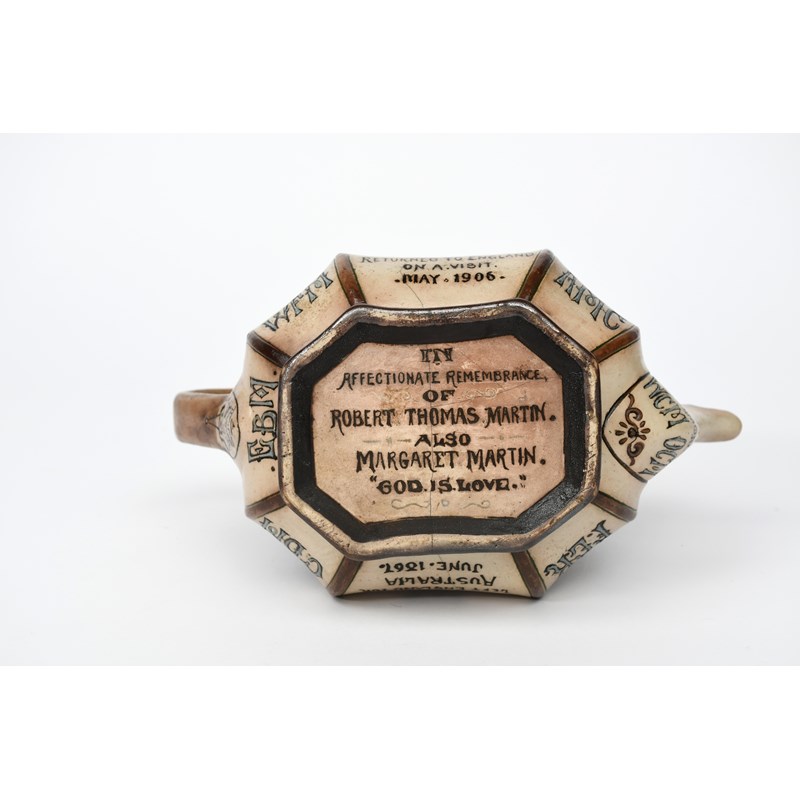 An historically important Martin Brothers stoneware Commemorative teapot and cover made by the brothers together, dated 1906, made to commemorate the return of their brother James A Martin to England from Australia, faceted octagonal form, incised with panels 'JAM left England for Australia June 1867' and 'JAM returned to England on a visit May 1906', incised panels of Martin family initials, the cover with nine flying House Martin birds, in brown and blue on a buff ground, the base inscribed ' In Affectionate Remembrance of Robert Thomas Martin also Margaret Martin, God is Love', the brothers parents, incised to cover 8-1906 Martin Bros London & Southall, minor damages, 24cm. wide (2)