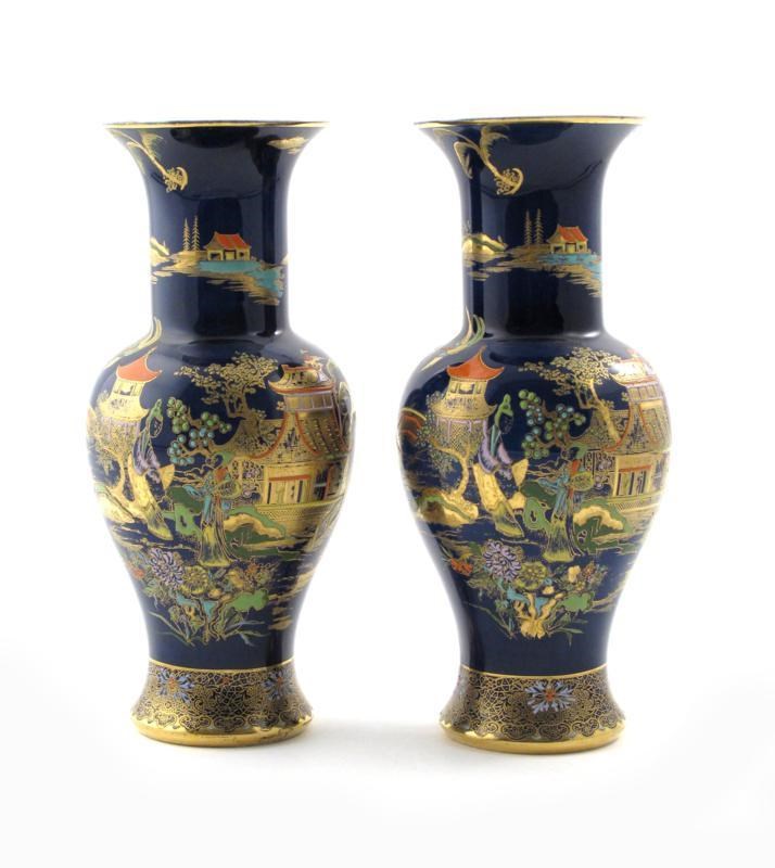 'Mikado' a near pair of Carlton Ware baluster vases, pattern 2364, printed and painted in colours and gilt on a blue ground and printed and painted marks, tallest 27.5cm. high