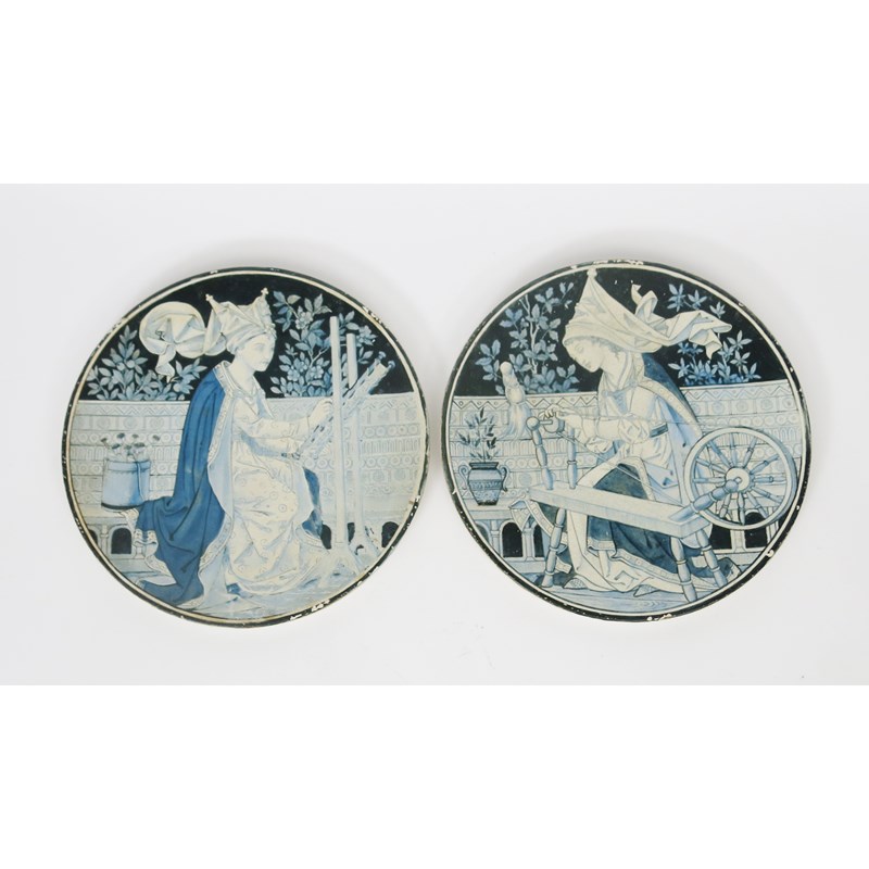 A pair of Arts and Crafts pottery chargers possibly Copeland, each painted with a medieval maiden in a formal garden, one working on an embroidery, the other at a spinning wheel, in shades of blue on a white ground, impressed and painted numbers to reverse, star-crack to one, the other a hairline to the rim, 34cm. diam.