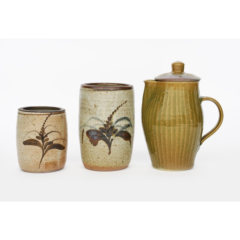 a Lowerdown Pottery stoneware vase, cylindrical form with inverted top rim, painted in tenmoku and blue with a simple fern frond, on an oatmeal ground, and another smaller, and a fluted coffee pot and cover covered in an ash green glaze by Jeremy Leach impressed Lowerdown marks to two vases, 18cm. high (Tallest vase), (3)