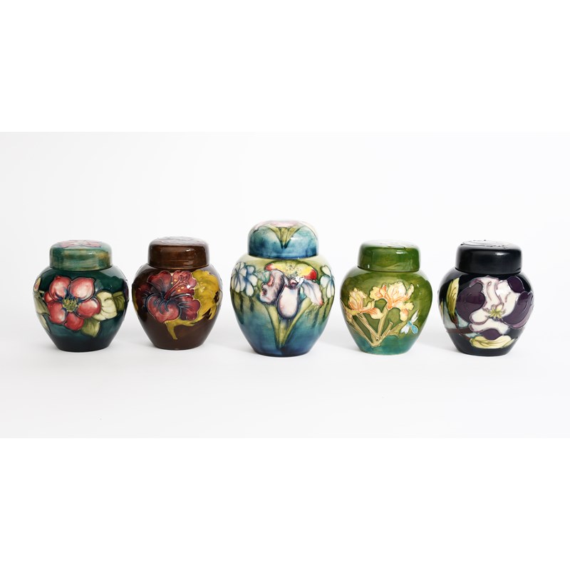 'Springflowers' a Moorcroft Pottery ginger jar and cover, painted with springflowers and Orchids, in colours on a graduated blue and green ground, a Moorcroft ginger jar and cover painted with yellow iris, and three other Moorcroft ginger jar and covers in the 'Hibiscus', Magnolia' and 'clematis' patterns, impressed marks, painted blue signature, 13cm. high, (10)