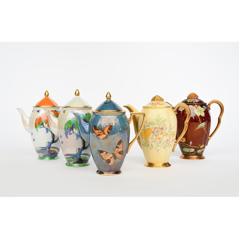 'New Flies' an Art Deco Carlton Ware coffee pot and cover, patter no.2625, printed and painted in colours and gilt on a blue lustre ground with butterflies, a Carlton Ware 'Kingfisher' coffee pot and cover, two 'Landscape Tree' coffee pots and covers, and another coffee pot and cover printed and painted with flowers printed and painted factory marks, one cover probably replacement, 21cm. high (10)