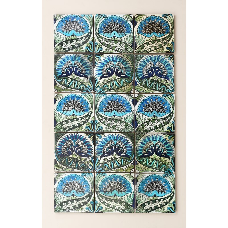 A William De Morgan Mongolian fifteen tile Persian panel, each tile with a single flower motif, painted in shades of blue, green and aubergine on a white ground, loosely mounted on board, old restoration 15cm. square