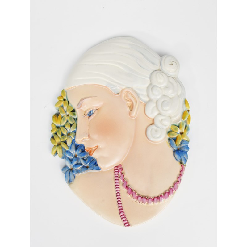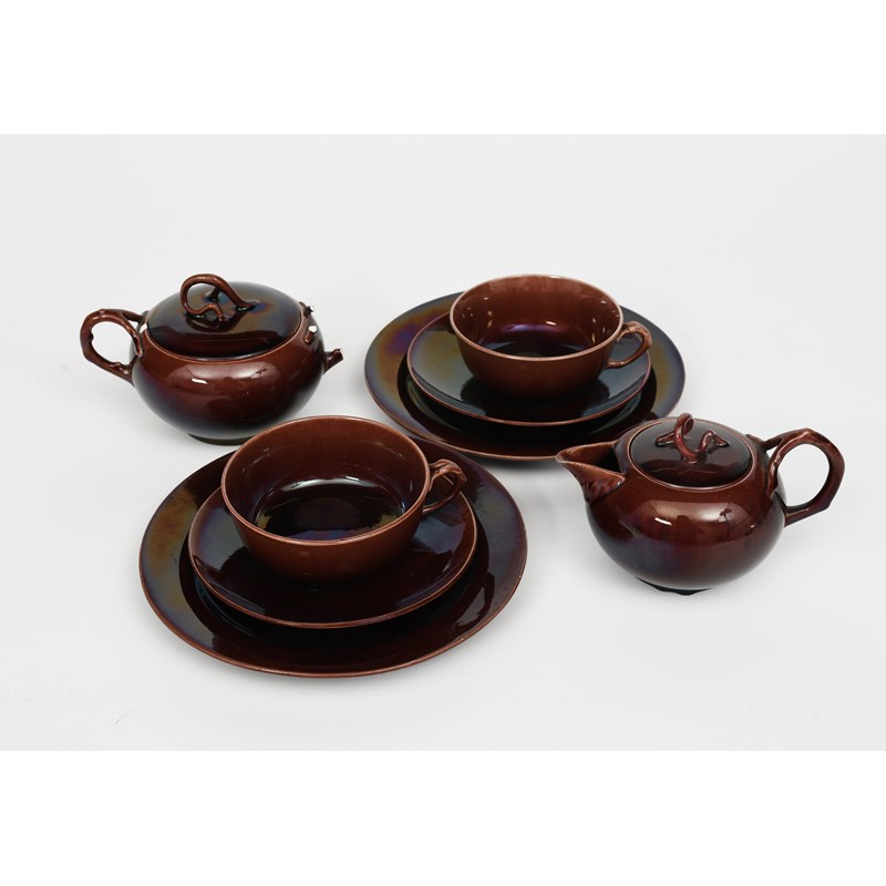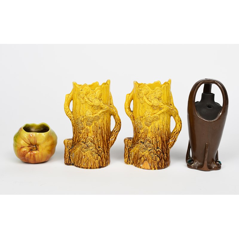 A pair of Ault Pottery vases, model no.475, each modelled as a tree trunk with flowering prunus, glazed yellow graduating to brown, an Aesthetic Movement Wedgwood red lustre tea for two set, two Bretby vases and a Beswick Woman with Beads wall plaque model no.436, impressed marks, museum restored chip to base of one, damage to tea set 18.5cm. high, (15)