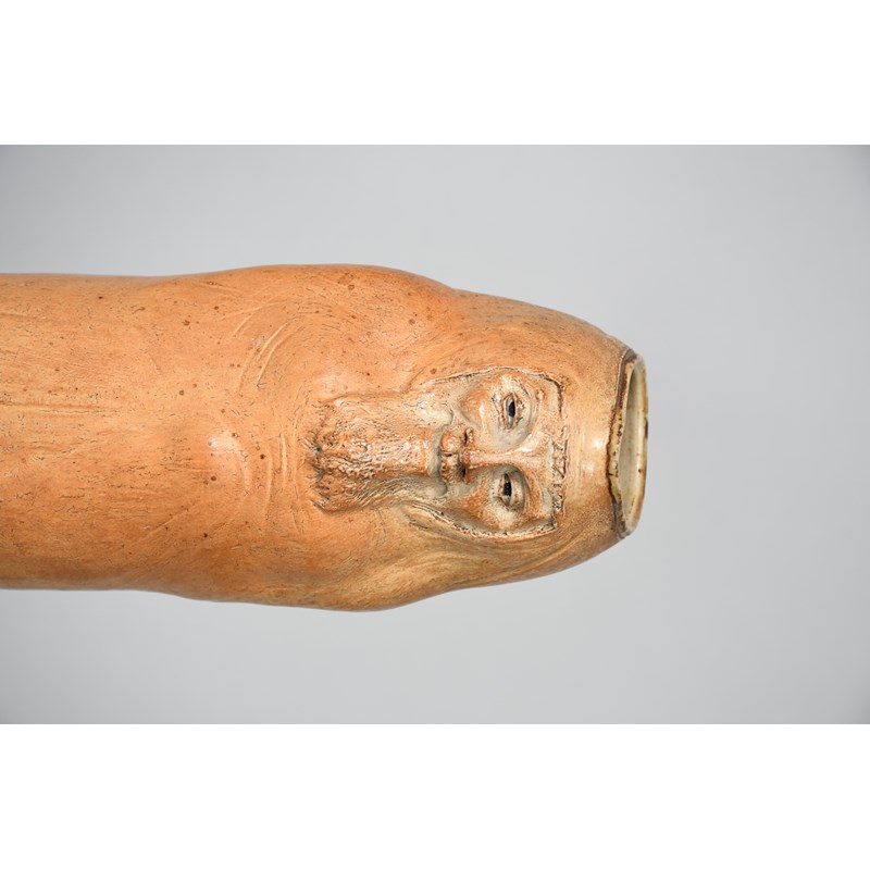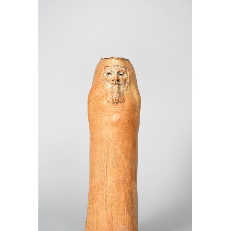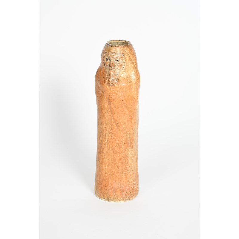 A rare Martin Brothers stoneware Eskimo jug, dated 1903, tall cylindrical form, modelled as a bearded man wearing a hooded fur coat, glazed tan and buff with white highlights, incised R W Martin & Bros, London & Southall, 20.6.1903, firing crack to body under handle, 37.5cm. high
