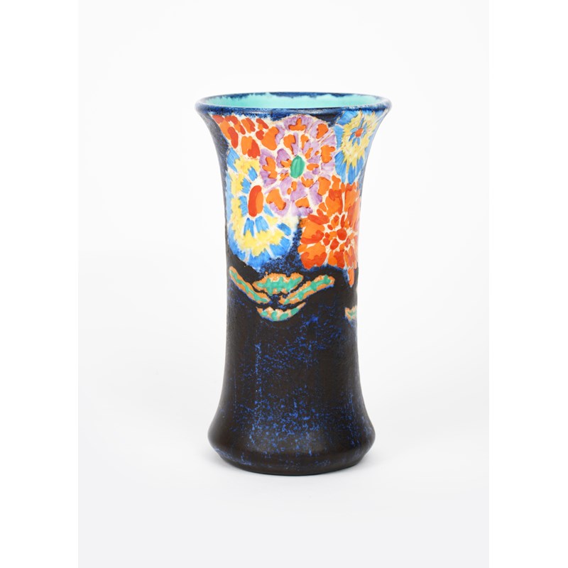 'Clouvre Waterlily' a Clarice Cliff Inspiration Bizarre vase, painted with flowers in colours on a mottled midnight blue ground over turquoise, printed factory marks, painted Clouvre, 21cm. high