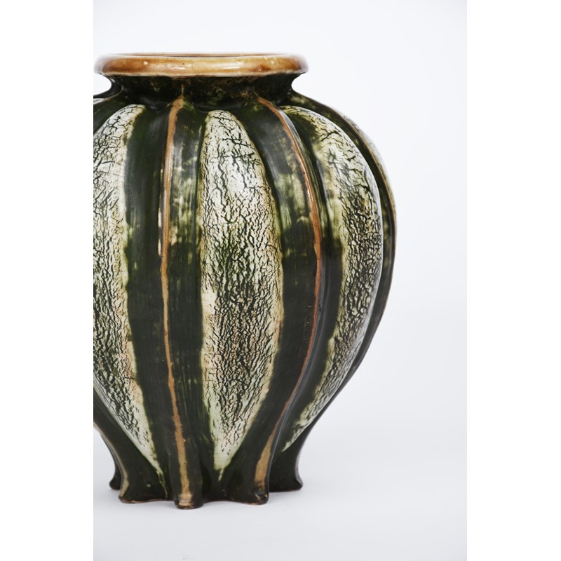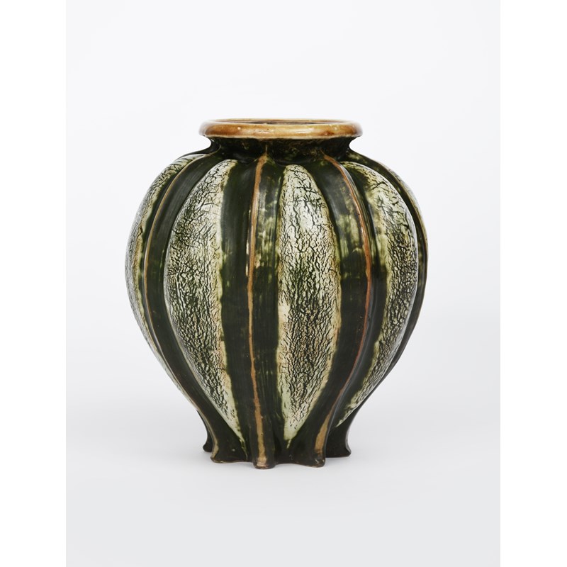 A large Martin Brothers stoneware gourd vase by Edwin and Walter Martin, dated 1900, ovoid with vertical green ribs forming a foot at the base, incised texture glazed green on a brown ground incised 11-1900 Martin Brothers London & Southall, 24.5cm. high
