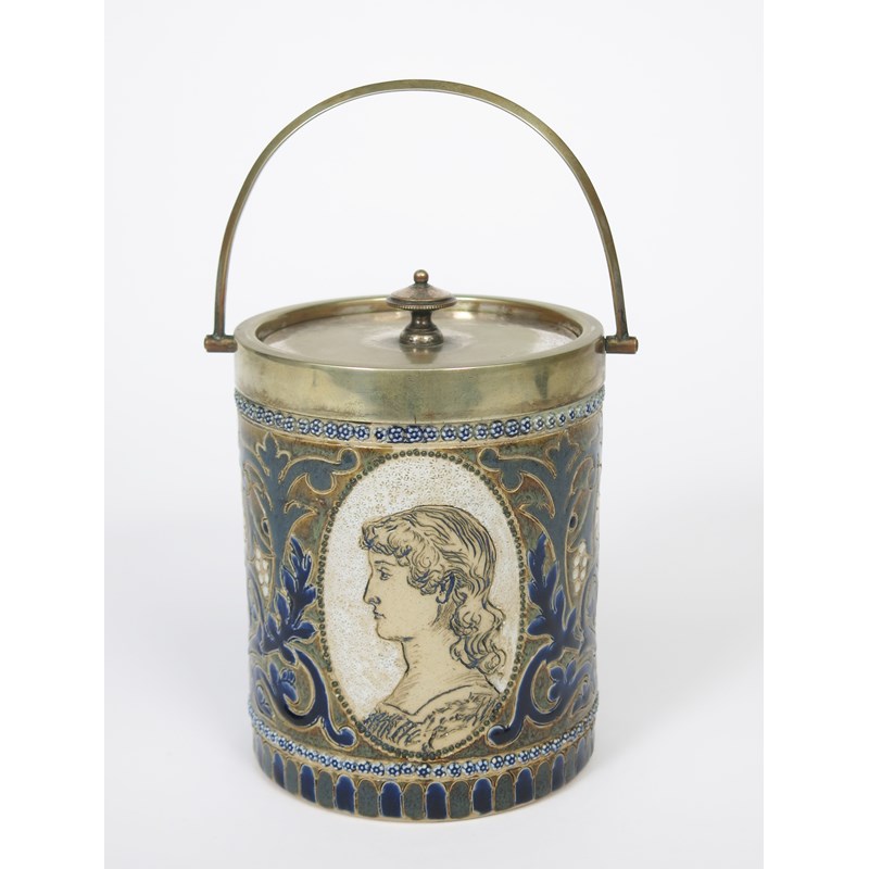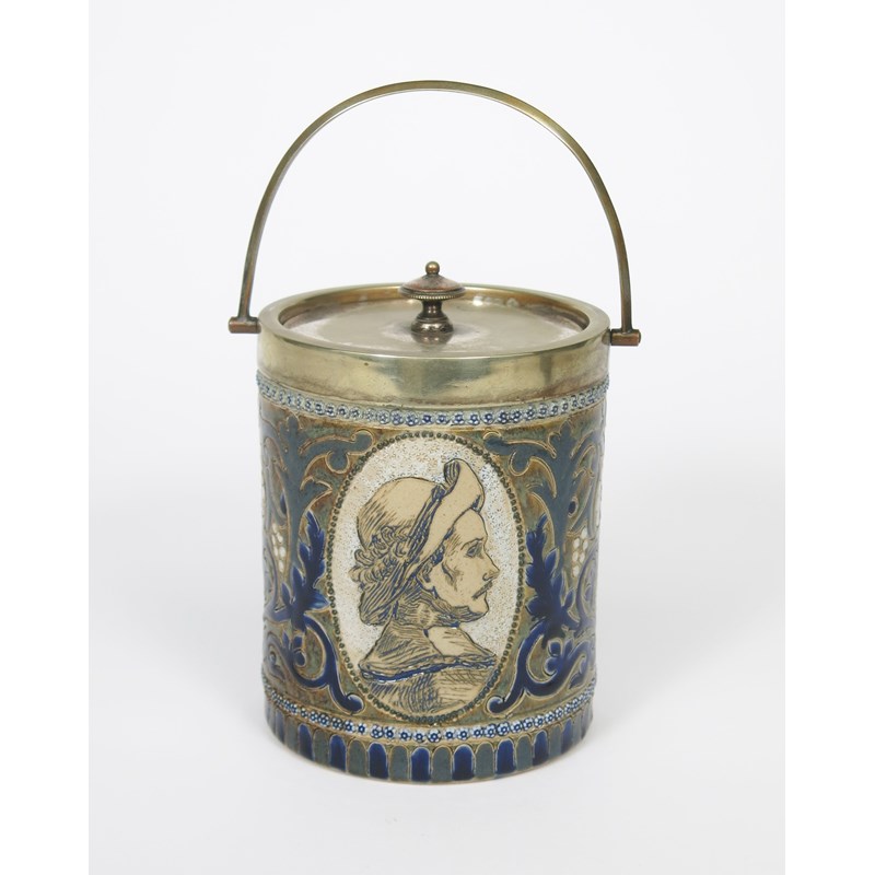 A Doulton Lambeth stoneware biscuit barrel with electroplated fittings and cover, dated 1886, cylindrical form, incised with medieval couple portrait roundels on stippled ground, inside scrolling foliage, glazed green, blue and ochre, highlighted in white on a buff ground, impressed factory marks, incised artists monograms, 18.5cm. high