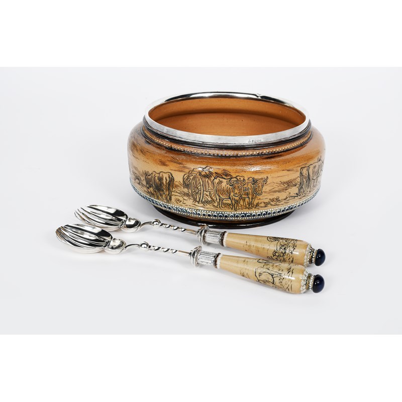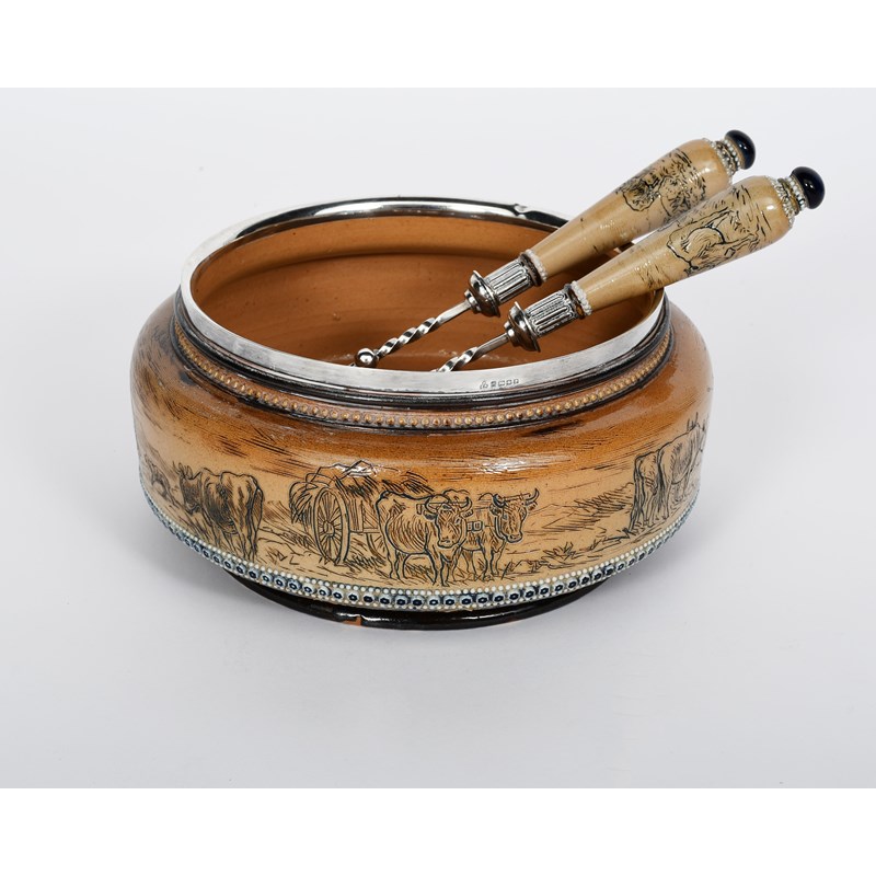 A Doulton Lambeth stoneware salad bowl and servers by Hannah Barlow, the bowl dated 1880, incised with a frieze of resting and grazing cattle, a farm dog watches on as a farm hand walks from a loaded hay cart, between bead-work bands and a band of applied florets, in shades of brown, blue and green on a buff ground, the servers with sheep and cattle handles, the silver mounts by Jehoiada Rhodes, impressed Doulton mark, stamped makers marks, Sheffield 1880 to the bowl and 1878 to the servers, 23cm. diam. (3)
