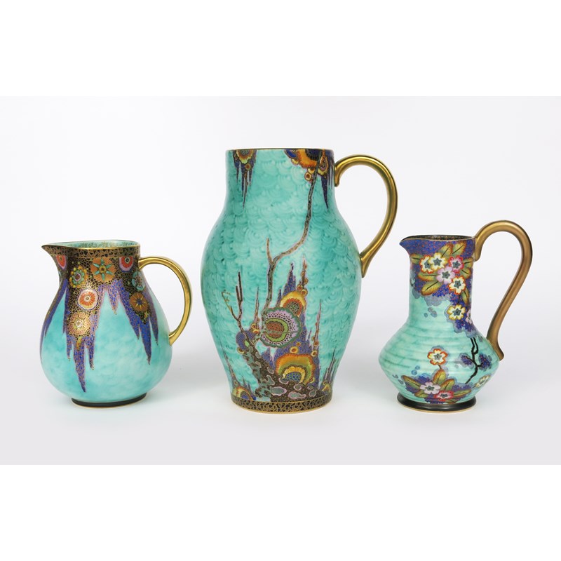 A Fielding's Crown Devon Mattajade single-handled vase, model no. 2342, shouldered, cylindrical form, printed and enamelled in colours and gilt with geometric flowers and foliage, on a textured turquoise ground, and two Crown Devon Mattajade jugs similar, printed and painted marks, 34cm. high, (3)