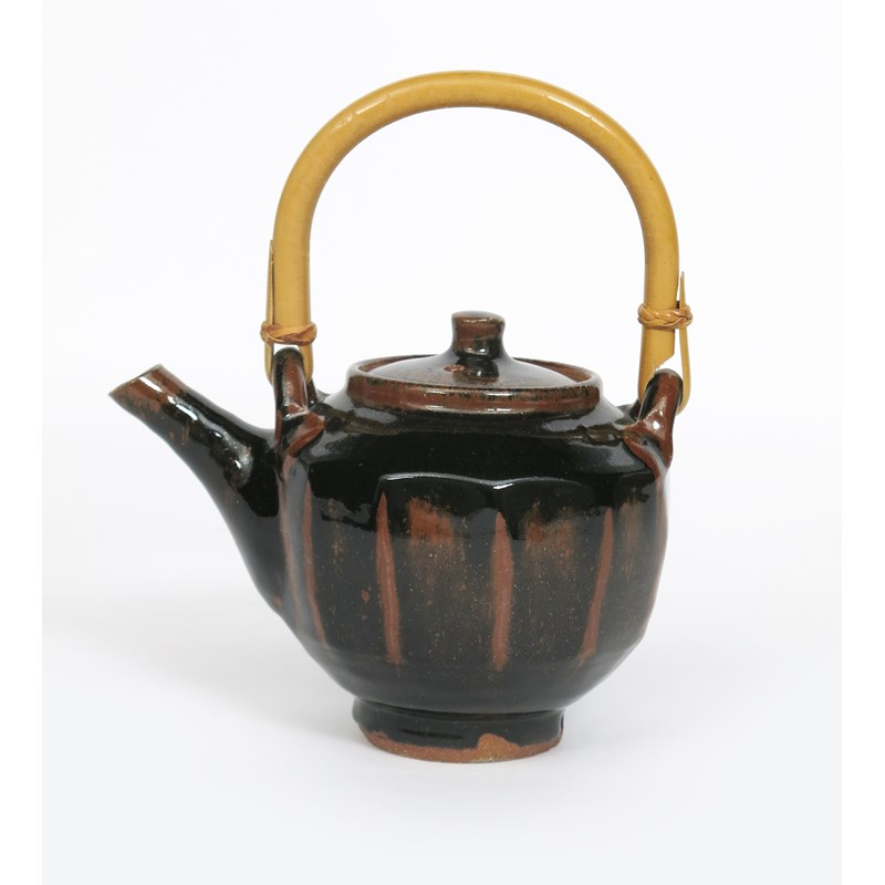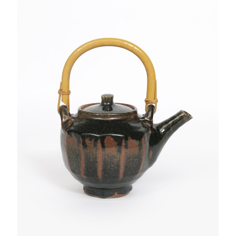 an Ainstable Pottery stoneware teapot and cover, with bamboo handle, cut-sided form covered in tenmoku glaze impressed seal marks, 14.5cm. high (2)