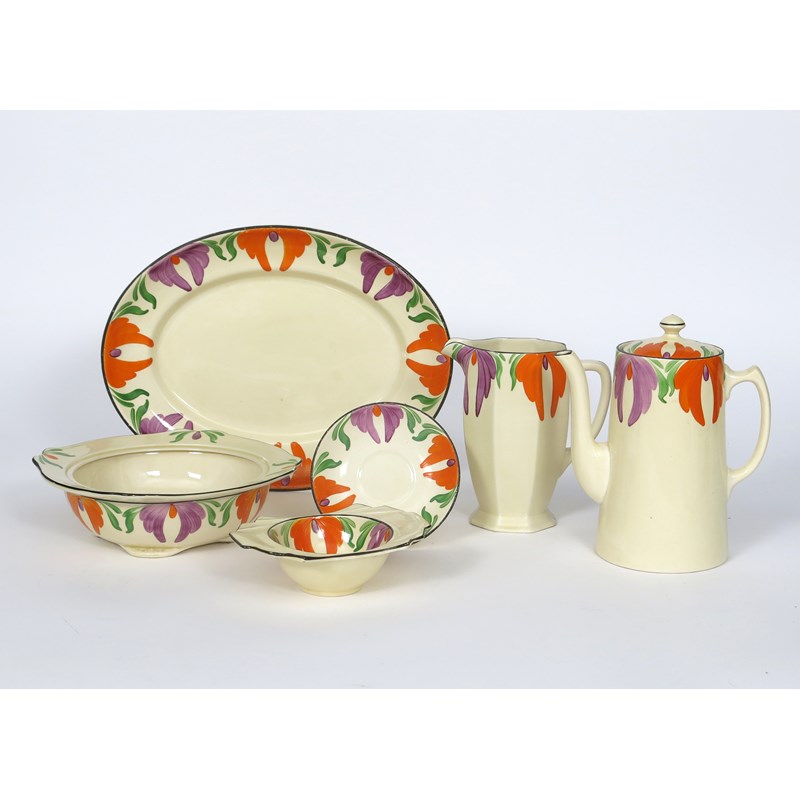 'Flaming June' a Clarice Cliff Athens jug for Brice Rogers Cottage Pottery, painted with flowers to the rim in orange, purple and green highlighted in black, a Tankard coffee pot and cover, a meat platter, tureen base, saucer and a Grapefruit bowl in the same pattern, printed Honeyglaze, Brice Rogers and Flaming June mark, chips to foot rim, 18cm. high (7)
