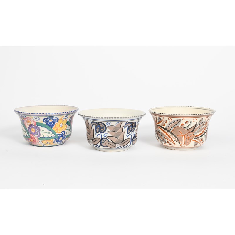 A Carter Stabler & Adams Poole Pottery bowl designed by Truda Carter, painted by Mary Brown, pattern MW, painted with geometric flowers in shades of blue, mushroom and black on a white ground, another similar pattern JF by Anne Hatchard and another pattern YC, impressed and painted factory marks, damages, 24cm. diam, (3)