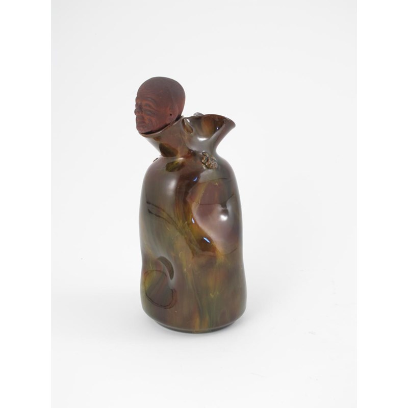 A rare Linthorpe Pottery Fijian sake bottle designed by Dr Christopher Dresser, the dimpled body glazed streaked green and ochre, with unglazed terracotta head unsigned, professionally restored spout 19cm. high