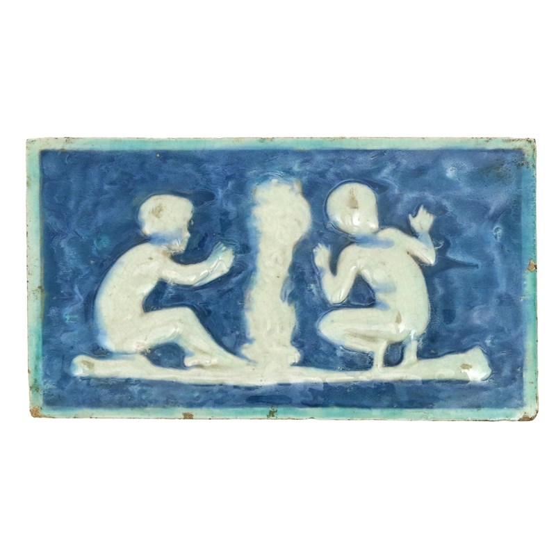 A Della Robbia Pottery plaque by Emily Margaret Wood, rectangular, cast in low relief with two naked boys sitting beside a campfire, glazed blue and turquoise, incised numbers and EMW monogram, minor glaze chips, 23.5 x 13cm.