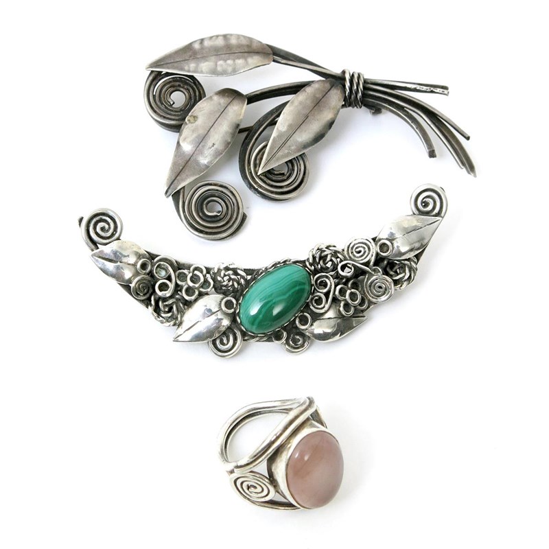 A Gladys & Charles Mumford silver brooch, crescent form, with wirework leaves and foliage, set with central malachite stone, another Mumford silver brooch modelled as bunch of flowers and foliage and a ring, ring stamped 925, 7.5cm. wide. (3)