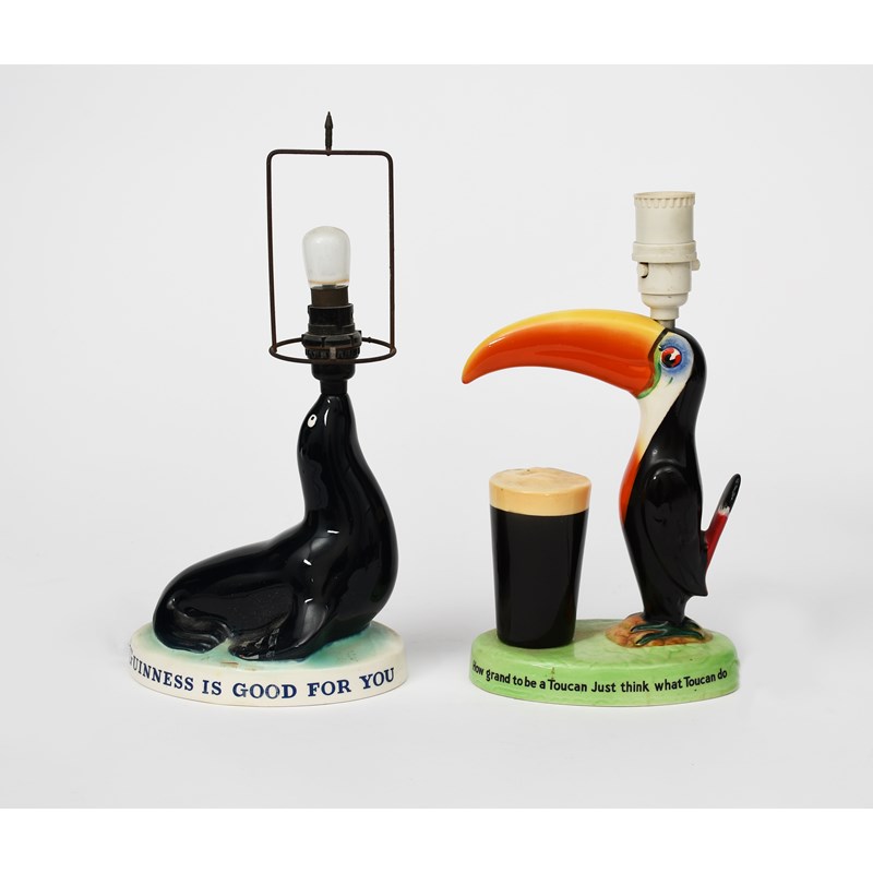 A Carlton Ware Guinness Toucan table lamp, modelled standing beside a pint of Guinness, glazed in colours, and a Carlton Ware Guinness Advertising Sea Lion table lamp, printed factory marks, Toucan restored,