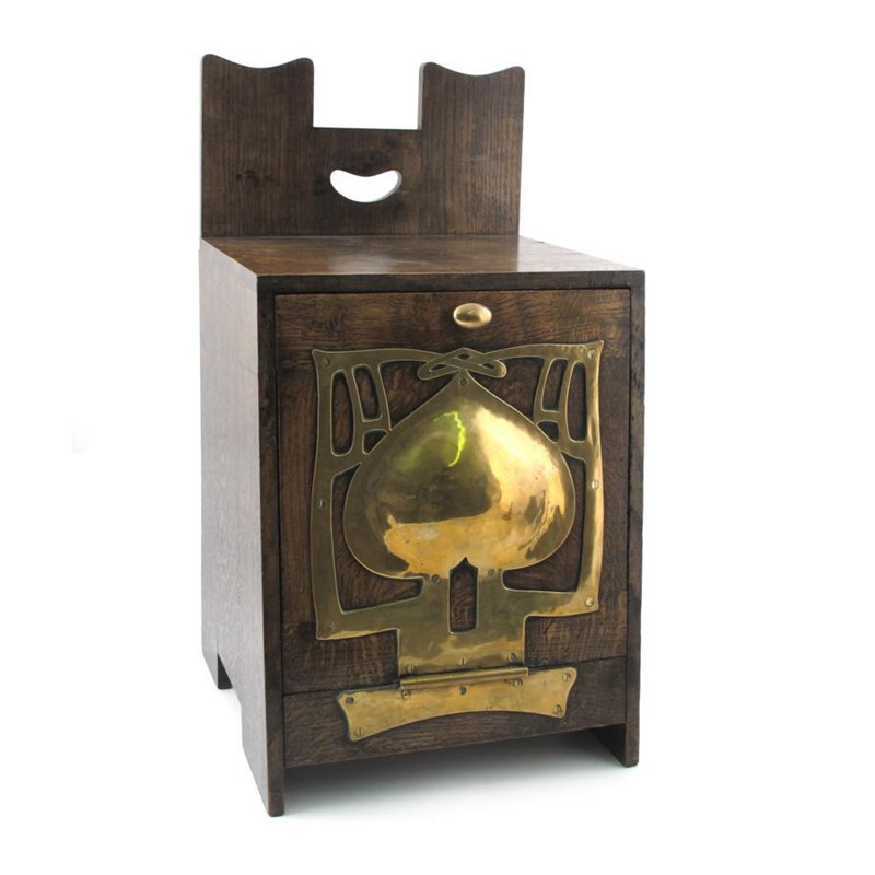 A Liberty & Co brass mounted oak coal bin, the design attributed to Leonard Wyburd, rectangular with hinged front, the back splat with cut out heart handle, with brass foliate design applied to the door unsigned 70cm. high