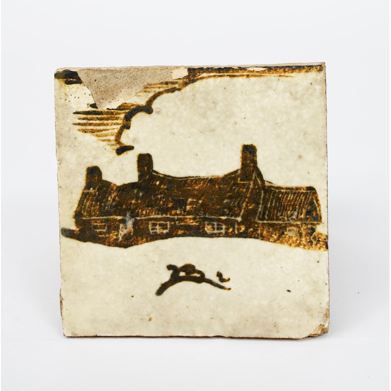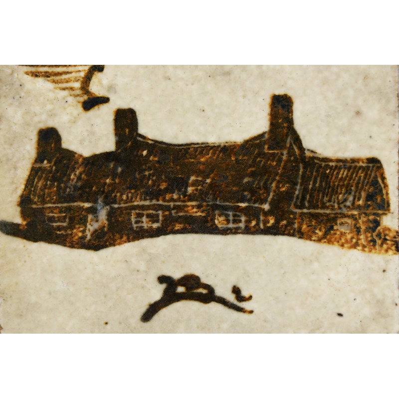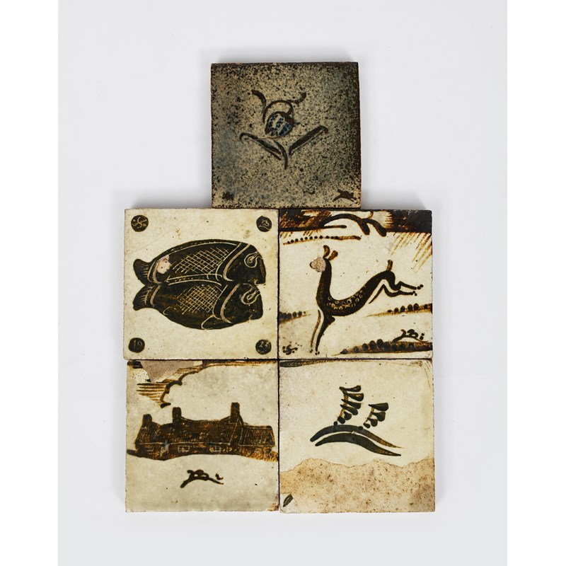 a Leach Pottery stoneware tile dated 1933, painted with two fish in tenmoku on a cream ground, another painted with a fritillary flower stem, another painted with a running deer, another with a pottery and another painted with a symbol,