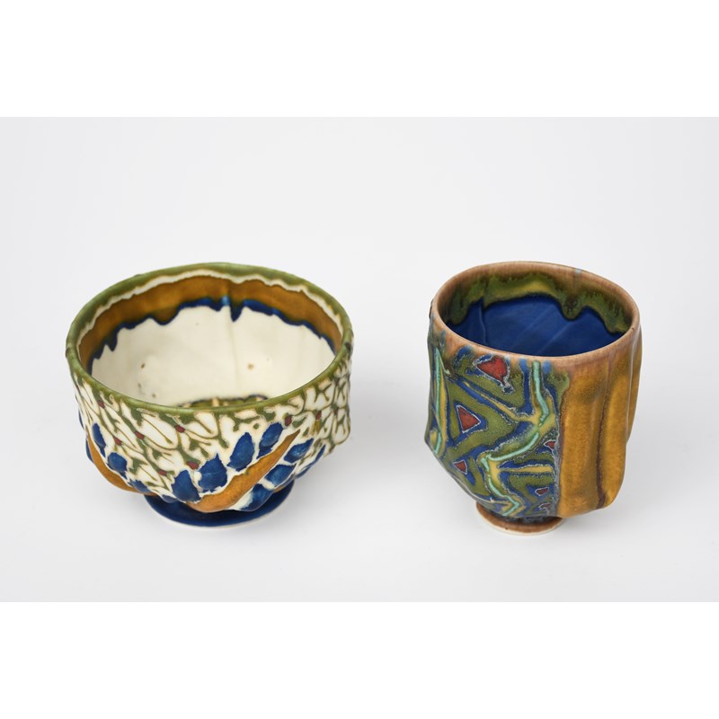 a porcelain chawan, dated 1992, faceted form with painted decoration and a footed unomi by Bruce Winn