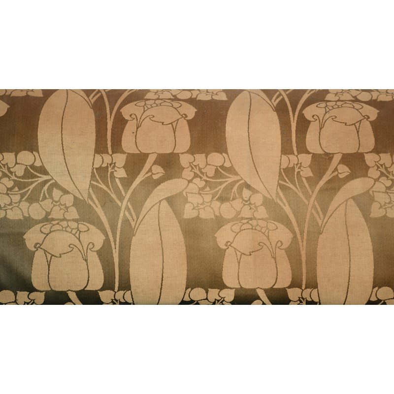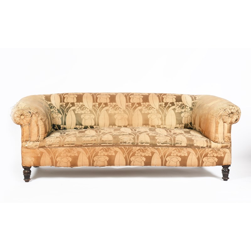 An Art Nouveau Chesterfield settee possibly retailed by Liberty & Co, horse hair padding, with Art Nouveau tapestry upholstery possibly by Harry Napper, decorated with tulip flowers unsigned 192cm. wide