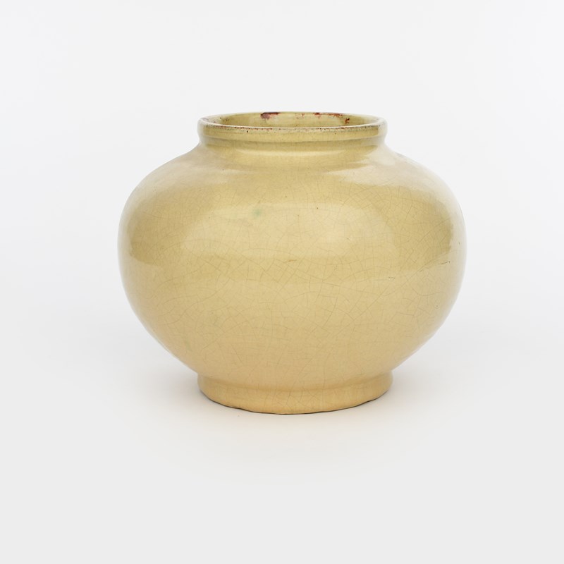 a Soon Pottery vase, ovoid with collar rim, covered in a streaked sand yellow glaze with rust spots to the top rim, , impressed Soon, 18.5cm. high