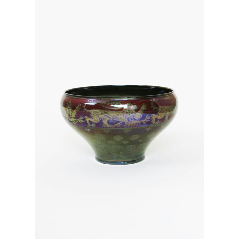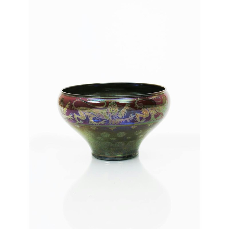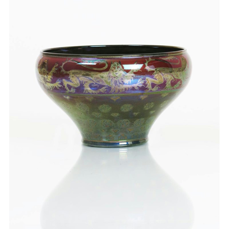 A Catalogue of the Lancastrian Pottery at Manchester City Art Galleries, catalogue number 186 for a comparable piece. This design, also known as the Lion Bowl, painted by Richard Joyce was exhibited at the Franco British Exhibition in 1908.