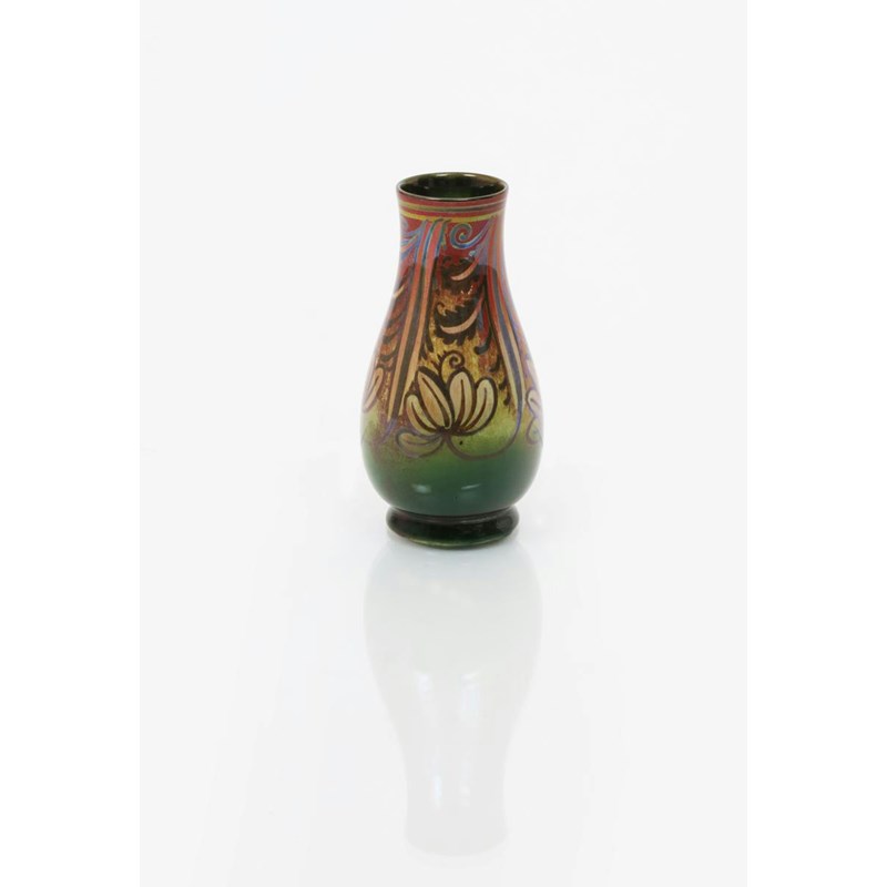 A Pilkington's Lancastrian vase by William S Mycock, shape no.2767, slender, swollen cylindrical form painted with waterlily flowers in bronze lustre on a streaked red and green glaze impressed mark, painted monogram 13cm. high