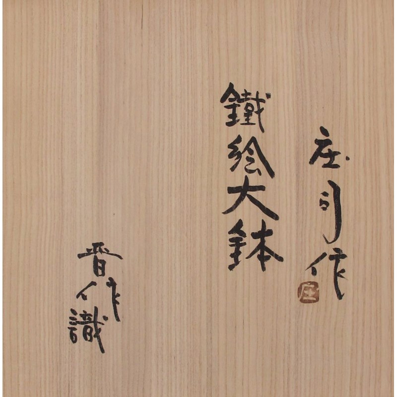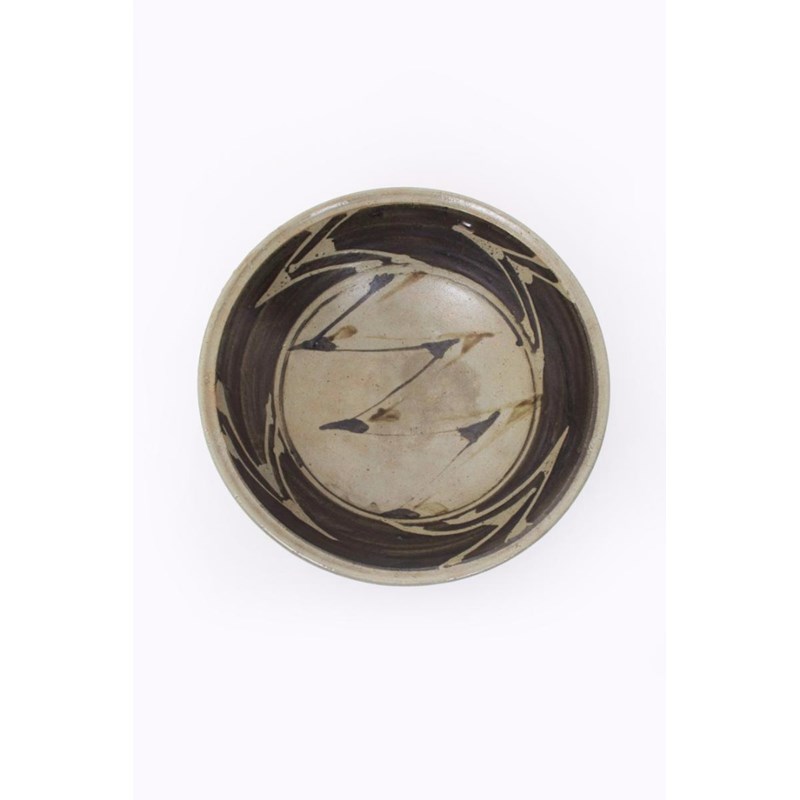 a large stoneware bowl, circa 1955, painted tenmoku brush design to the well, the rim with resist design in wooden box signed to the box 42cm. diam.