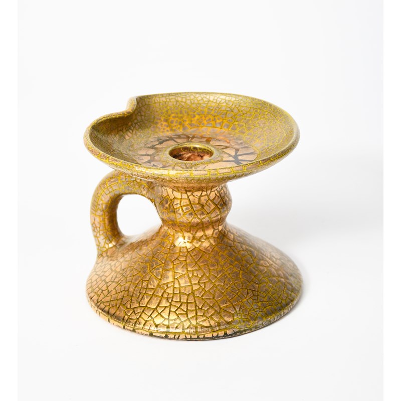 A Sunflower Pottery chamberstick by Sir Edmund Elton, tapering cylindrical form, covered in a crackled gold glaze over yellow and lime green painted Elton, 11cm. high, 12.5cm. diam.