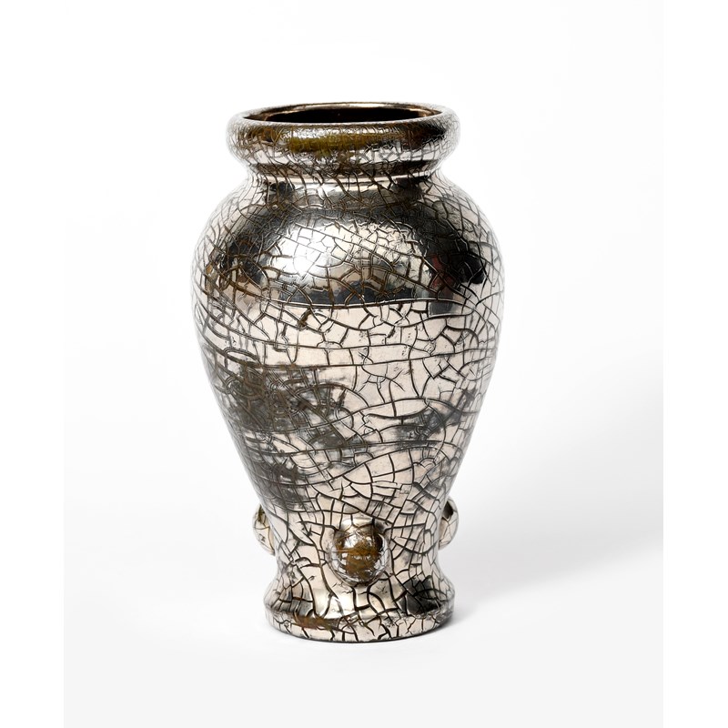 A Sunflower Pottery vase by Sir Edmund Elton, shouldered form with knopped neck and modelled cabochon to the base, covered in a crackled gold lustre glaze over green, painted Elton mark, 19.5cm. high