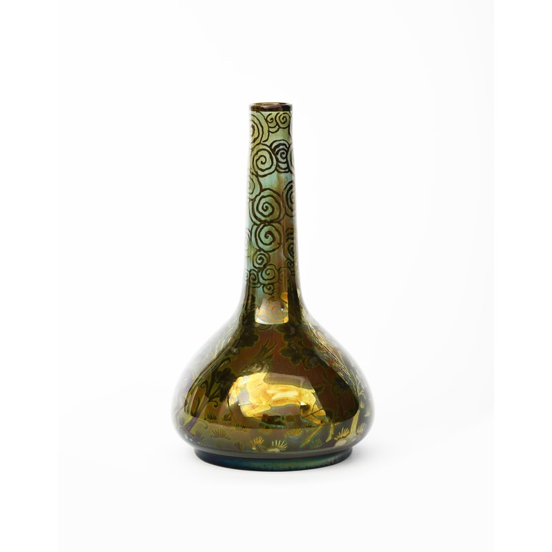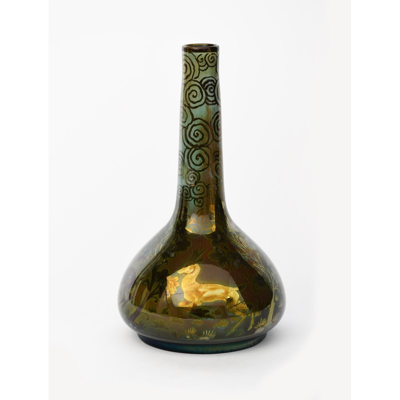 A Pilkington's Lancastrian solifleur vase by Richard Joyce, dated 1919, compressed ovoid body with cylindrical neck, painted with three deer running through a woodland, in golden lustre on a graduated ground, impressed factory marks, painted artist cipher and date mark, 22.5cm. high