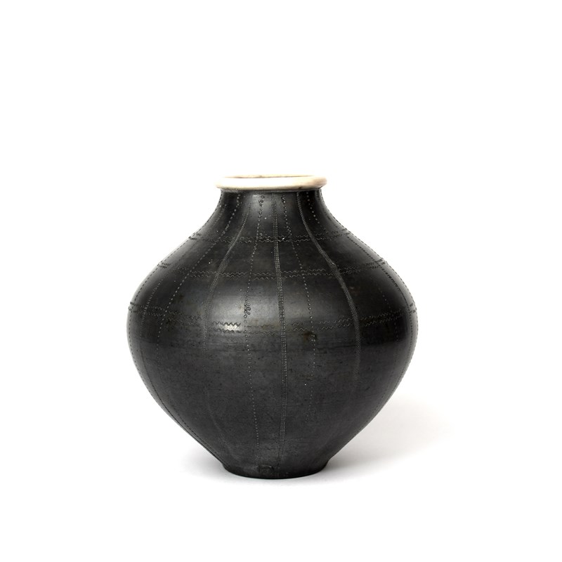 a large raku vase, ovoid with collar rim, incised column and band decoration, burnished black, the rim white