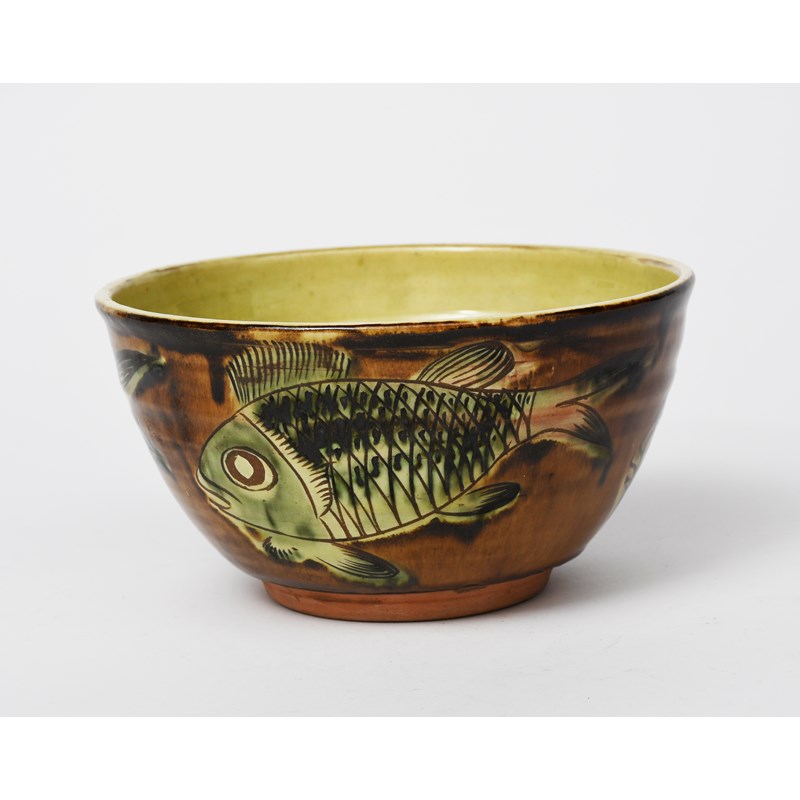 an earthenware footed bowl, painted with a frieze of large scaly fish under a streaked green and ochre glaze